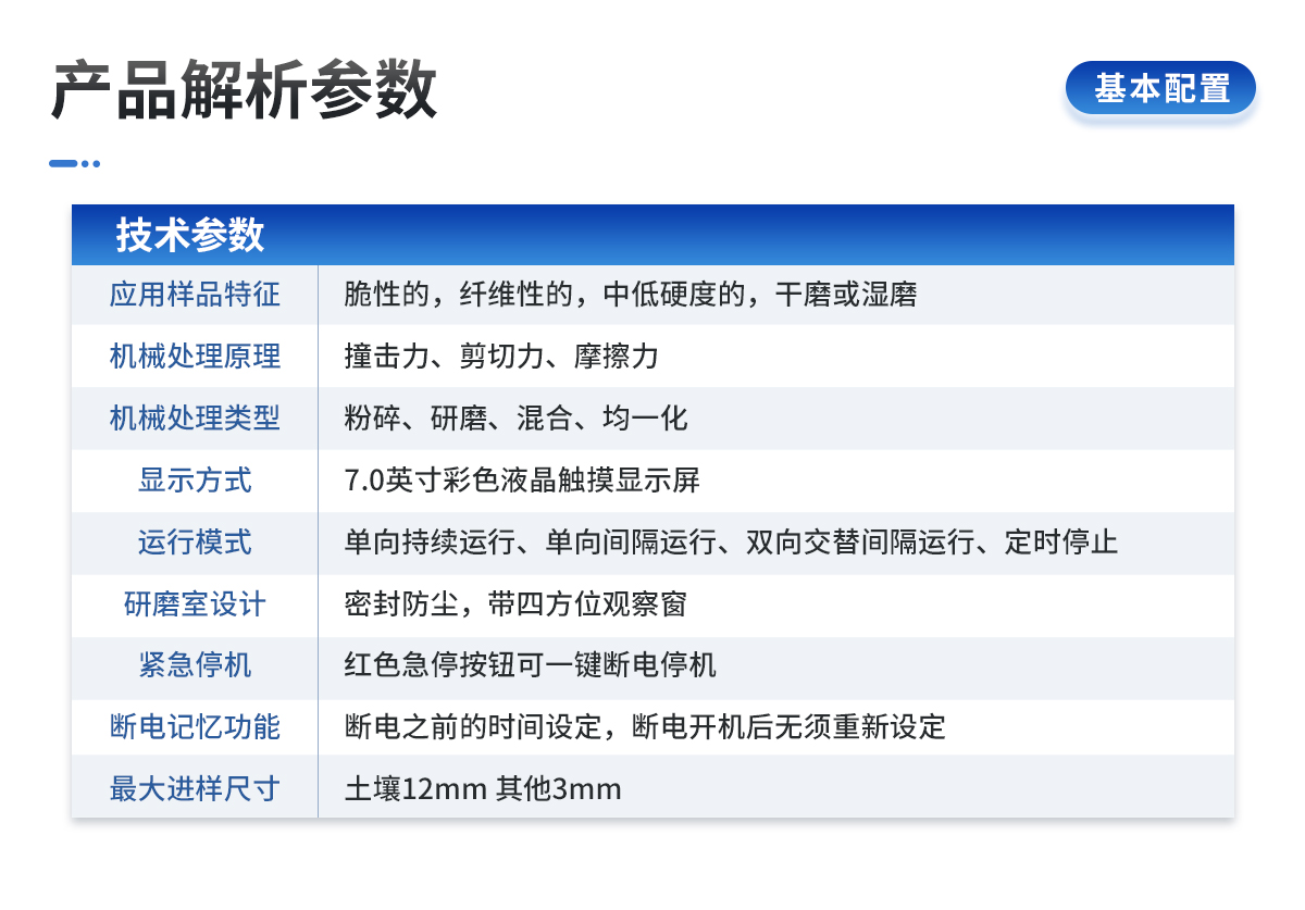 | 應(yīng)用領(lǐng)域:土壤、地質(zhì)、環(huán)保、第三方檢測、農(nóng)牧業(yè)、農(nóng)產(chǎn)品質(zhì)量、資源與環(huán)境等,土壤制樣、重金屬分析 | 應(yīng)用樣品特征:脆性的,纖維性的,中低硬度的,干磨或濕磨 | 儀器機(jī)械處理原理:撞擊力、剪切力、摩擦力 | 儀器機(jī)械處理類型:粉碎、研磨、混合、均一化 | 控制系統(tǒng):觸摸屏、無線遙控 | 遠(yuǎn)程遙控:標(biāo)配無線遙控器,可遠(yuǎn)距離控制研磨機(jī)的啟動、停止、加速、減速以及可切換三種運(yùn)行模式(單向持續(xù)運(yùn)行,單向間隔運(yùn)行,雙向交替間隔運(yùn)行) | 顯示方式:7.0寸彩色液晶顯示屏,可顯示、觸控操作運(yùn)行模式、運(yùn)行時間、轉(zhuǎn)速、交替運(yùn)行間隔 | 運(yùn)行模式:單向持續(xù)運(yùn)行、單向間隔運(yùn)行、雙向交替間隔運(yùn)行、定時停止 | 連續(xù)運(yùn)行時間設(shè)定:0.1~9999.9分鐘 | 交替、單向間隔暫停時間設(shè)定:0.1~9999.9分鐘 | 主盤轉(zhuǎn)速:50-450min | 研磨罐轉(zhuǎn)速:100-900min | 傳動比(行星盤、研磨罐):1:2 | 可連續(xù)工作(滿負(fù)荷):90h | 緊急停機(jī):紅色急停按鈕可一鍵斷電停機(jī) | 斷電記憶功能:斷電之前的時間設(shè)定,斷電開機(jī)后無須重新設(shè)定 | 過載保護(hù)功能:有 | 研磨室設(shè)計:密封防塵,帶四方位觀察窗 | 同時處理樣品種數(shù):4種 | 適用研磨罐:本機(jī)是新款通用型,100ml、250ml、500ml三種規(guī)格研磨罐均可使用,可根據(jù)客戶需求同時放不同規(guī)格的罐;對角對稱即可(4個研磨罐為一套)。 | **進(jìn)樣尺寸:土壤12mm 其他3mm | 研磨罐配球量:罐子容積的三分之一 | **裝樣量:研磨罐容積的三分之二 | 出樣粒度:*小可達(dá)0.1um(即1.0×10mm-4) | 研磨罐材質(zhì):瑪瑙、陶瓷、聚四氟乙烯、氧化鋯、聚氨酯、不銹鋼、尼龍、碳化鎢、硬質(zhì)合金等可選(常用瑪瑙、氧化鋯研磨罐) | 研磨球材質(zhì):瑪瑙、氧化鋯、不銹鋼、陶瓷、硬質(zhì)合金、碳化硅等 | 研磨球直徑:3、5、10、15、20mm(根據(jù)實(shí)際需求配置) | 電源端口:國標(biāo)、歐標(biāo)、美標(biāo)、英標(biāo)等 | 電機(jī)轉(zhuǎn)速、功率、電壓:1400rpm、0.75kw、220V±10%單相,50/60Hz | 凈重:80kg | 尺寸(長寬高):756*484*488mm | 噪聲描述:60dB | 防護(hù)等級:IP60 | 標(biāo)準(zhǔn)配置:研磨儀主機(jī):1臺; | 研磨罐鎖緊裝置:1套4個; | 250ml研磨機(jī)研磨罐保護(hù)裝置:1套4個; | 100ml研磨機(jī)研磨罐保護(hù)裝置:1套4個; | 電源線:1根; | 說明書:1本; | 保修卡:1張; | 合格證:1張 |